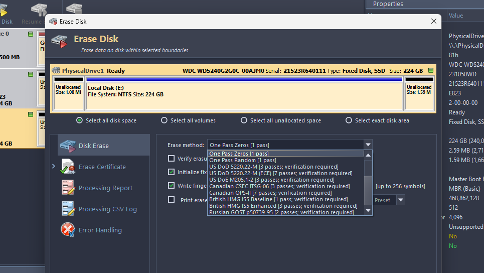 - In the following dropdown, choose the erase method. The ones on the top, like the Gutmann, have the higher erase passes, which will take more time and add to the total writes of your SSD and wear it. The ones on the bottom are the simplest, fastest, and generally enough for most people with personal data.