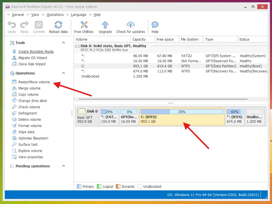 - Now, go back to the main menu, click the C: drive, and click Resize/Move volume.