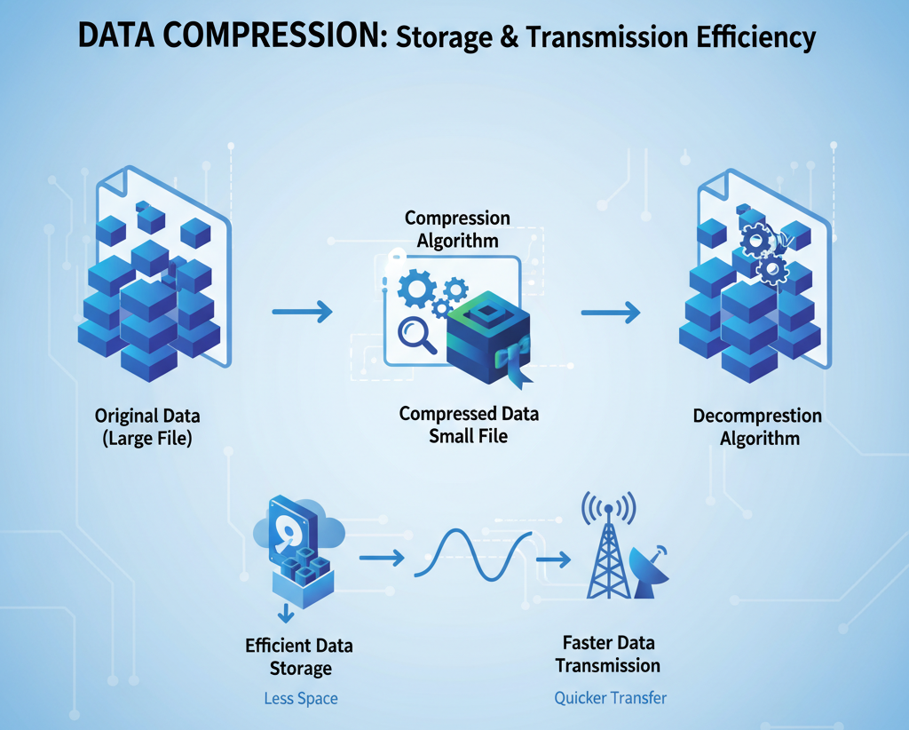 At its heart, data compression works by finding and eliminating redundancy. Imagine writing the sentence, “I like old songs and old movies.” The word “old” is redundant. You could create a rule: wherever you see the number ‘1’, replace it with “old”. The sentence becomes “I love 1 song and 1 movie.” We basically reduced the size of the sentence just by setting a rule. These rules are established using compression software and algorithms, and it is essential to remember them so that they can be decompressed when needed. In other words, at the retrieval end, we must know that “1” means the word “old”.
