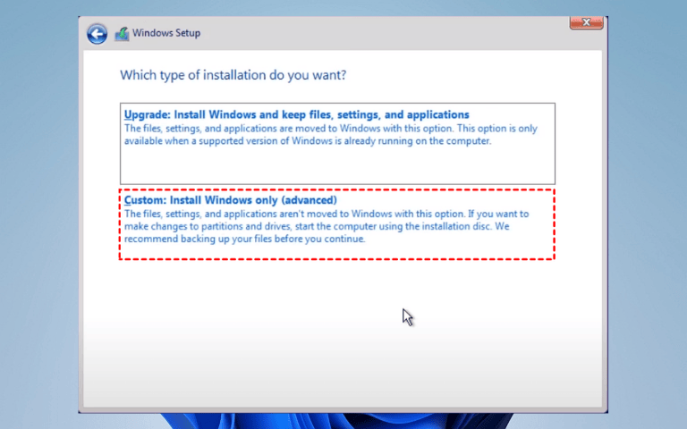 6. When asked for an installation type, choose:Â Custom: Install Windows only (advanced).
