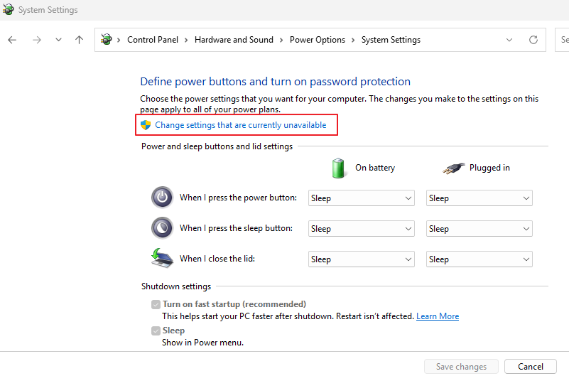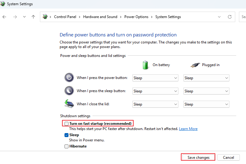 Step 4. Uncheck Turn on fast startup (recommended), and click Save changes.