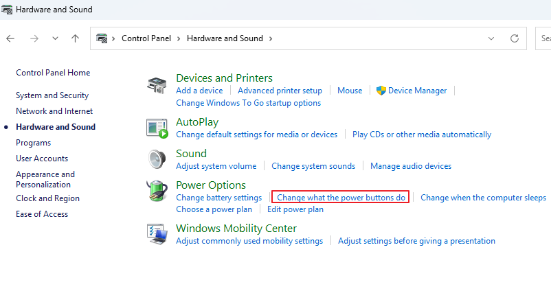 Step 2. Ensure “View by” is set to Category, click Hardware and Sound, and then select Power Options. Then, select Change what the power buttons do.