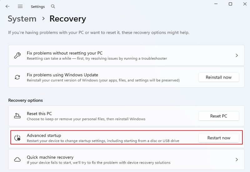 Step 2. Go to Settings > Recovery > Advanced Startup > Restart Now for Windows 11. (For Windows 10: Go to Settings > Update & Security > Recovery > Advanced Startup > Restart Now.)
