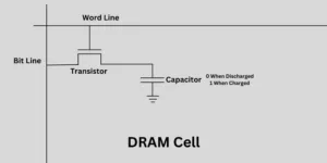 ADRAM uses a pair of a capacitor and a transistor to store one bit of data (1 or 0). The presence of charge represents 0, and the absence represents 1. However, this charge leaks over time, and it must be refreshed constantly. The access time of a DRAM is around 10 to 100 nanoseconds.
