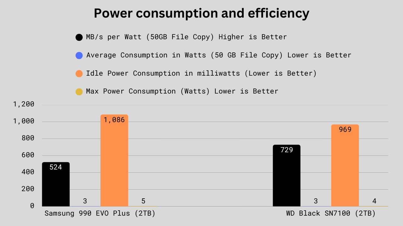 The WD Black SN7100 significantly outperforms the Samsung 990 EVO Plus in power efficiency metrics. The WD achieves 729 MB/s per watt, compared to Samsung’s 524 MB/s per watt, which is a substantial 39.1% advantage in efficiency.