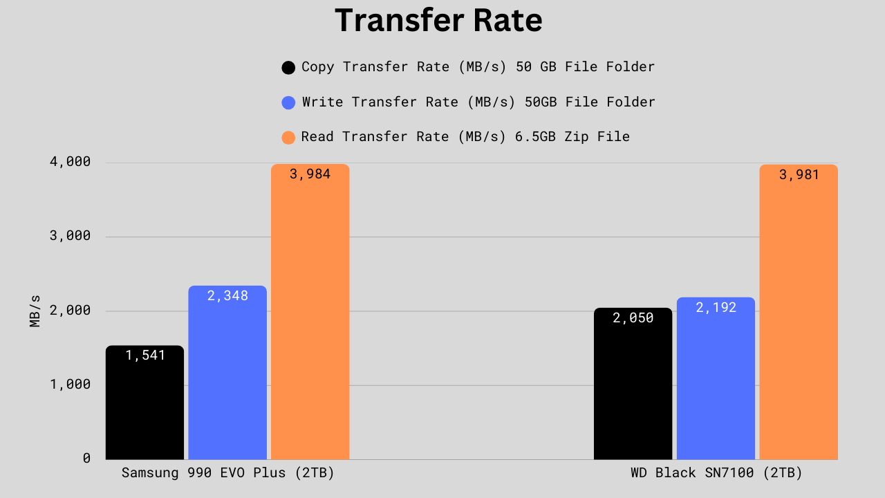 The WD Black SN7100 excels in copy operations with a 33% advantage over the Samsung 990 EVO Plus, making it ideal for users who frequently transfer large files or migrate data. However, Samsung takes the lead in write performance by 7%, which benefits content creators and users handling heavy write workloads. Read speeds are virtually identical between the two drives. Overall, the WD is better suited for mixed read/write tasks, such as file copying, while the Samsung edges ahead for pure write-intensive applications.