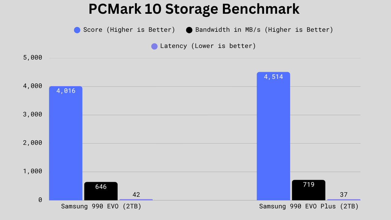 The Samsung 990 EVO Plus clearly outperforms the standard 990 EVO across all metrics in the PCMark 10 Full Drive Benchmark. The overall score jumps from 4,016 to 4,514, indicating noticeably better real-world system performance and responsiveness. Bandwidth also improves from 646 MB/s to 719 MB/s, reflecting faster data transfer capabilities that can make a tangible difference in heavy workloads, such as large file handling or content creation. Latency drops from 42 to 37, meaning the Plus model responds more quickly to requests. This can be helpful in both gaming and productivity tasks. In short, the 990 EVO Plus is going to perform better in the day-to-day productivity, gaming, and creative tasks.