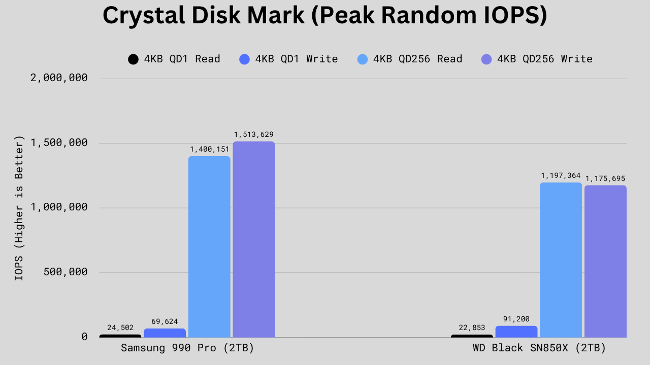 The maximum theoretical read IOPS are about 33% higher on the Samsung 990 Pro than on the SN850X. The write IOPS are about 29% higher on the 990 Pro. The sequential speed isn’t very different, but you’ll see significant differences in the benchmark scores.