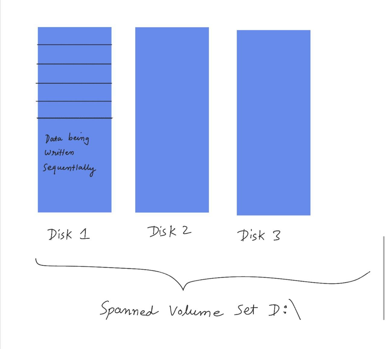 Data is written on the respective disks in a sequential manner. Writing in Disk 2 happens only when Disk 1 is filled up.