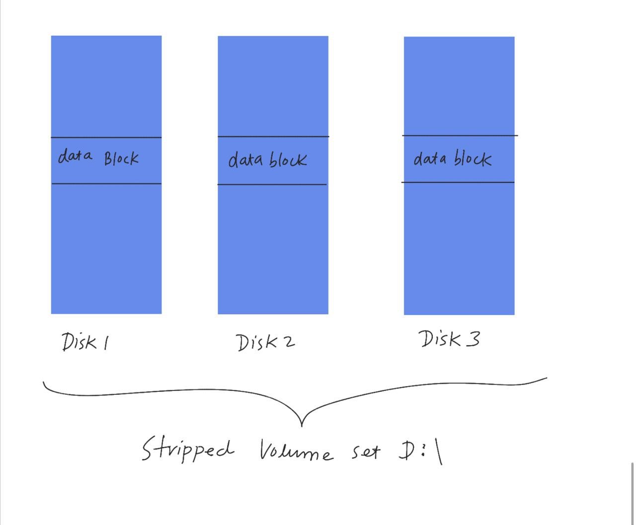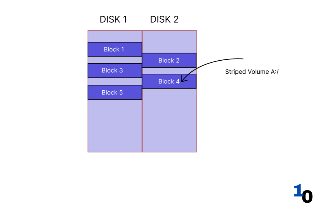 Disadvantage: Since the data is written to multiple disks similar to spanned volumes, there is no fault tolerance. i.e., if one disk fails, the entire data is lost.