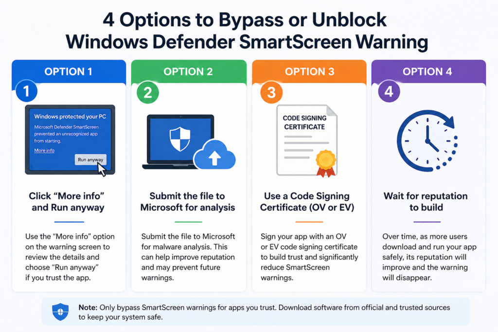 SmartScreen relies on cloud-based reputation scoring. If your application is new, the warning may disappear over time as more users download and run it safely. This process is automatic and requires no user action.